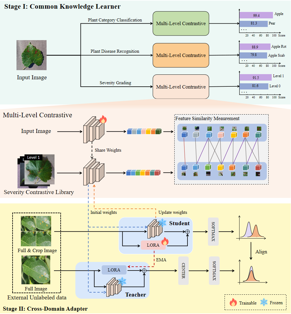 overview: We propose a unified framework for plant leaf disease classification and severity grading under open-set conditions, as shown in Fig. 1. It combines multi-level contrastive learning for labeled data, enabling the model to learn basic knowledge of plant species, diseases, and severity. A contrastive feature library anchors novel class identification, while a cross-domain adapter uses unlabeled out-of-domain data to align feature distributions. By expanding the label space without retraining the entire model, our framework provides robust generalization to unseen categories, improving plant disease diagnosis across diverse conditions.