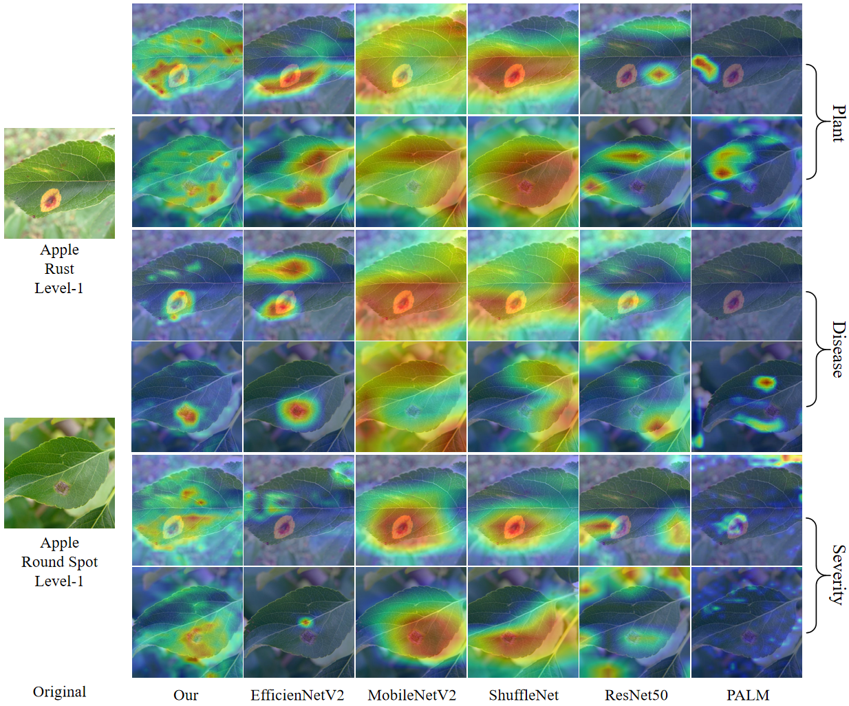 Figure 2: Heatmap visualization of Uniplant-CG and the baseline model. Uniplant-CG exhibits clearer focus on lesion areas and critical leaf regions, highlighting its stronger feature alignment and interpretability across domains..